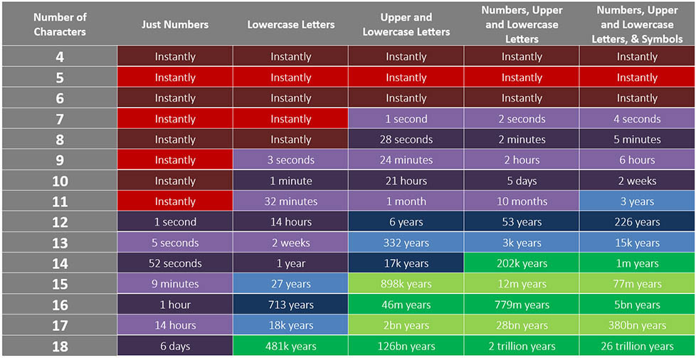 So you can see that weaker passwords can be cracked instantly, or within a few seconds or minutes. Once passwords have more characters and more complexity, it becomes *virtually* impossible to crack within someone’s lifetime.