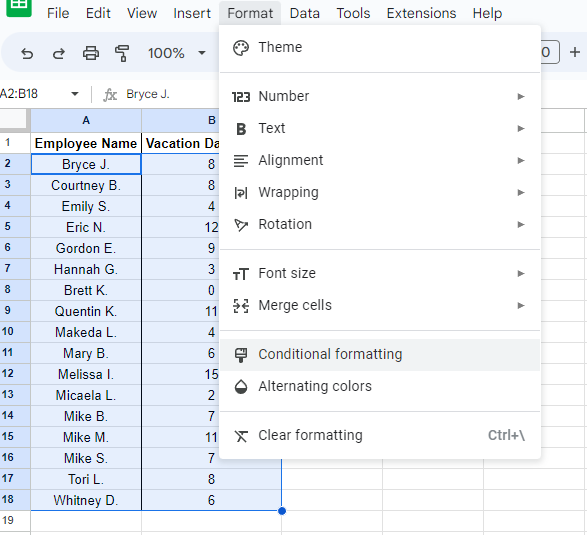 You just need to highlight the names and the numbers of days taken sick, select Format from the menu, and click on Conditional formatting.