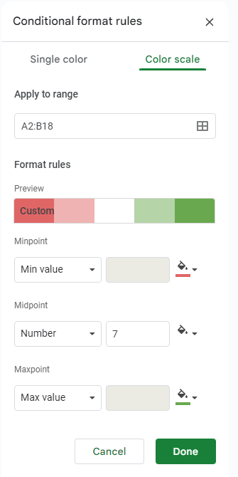 You’ll then see your selected range defined in the Apply to range box. You will see an additional field with Format rules available. Under Minpoint, make sure Min value is selected, and then you can select the color that you want to use to represent that value. For this example, we’re trying to determine which employees have used the least number of their available days, so we’ll go with red, as it’s a bit of a red flag. Under Maxpoint, do the same, but select Max value and select a different color. Since these employees are the ones who are using enough of their vacation days, we’ll use green.
