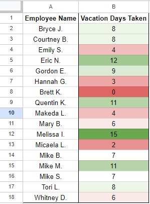 Click Done, and your spreadsheet will light up with different colors, with green representing the highest amount of days off and red representing the fewest. You will see below that as the number of days off escalates, colors change.